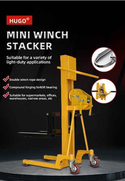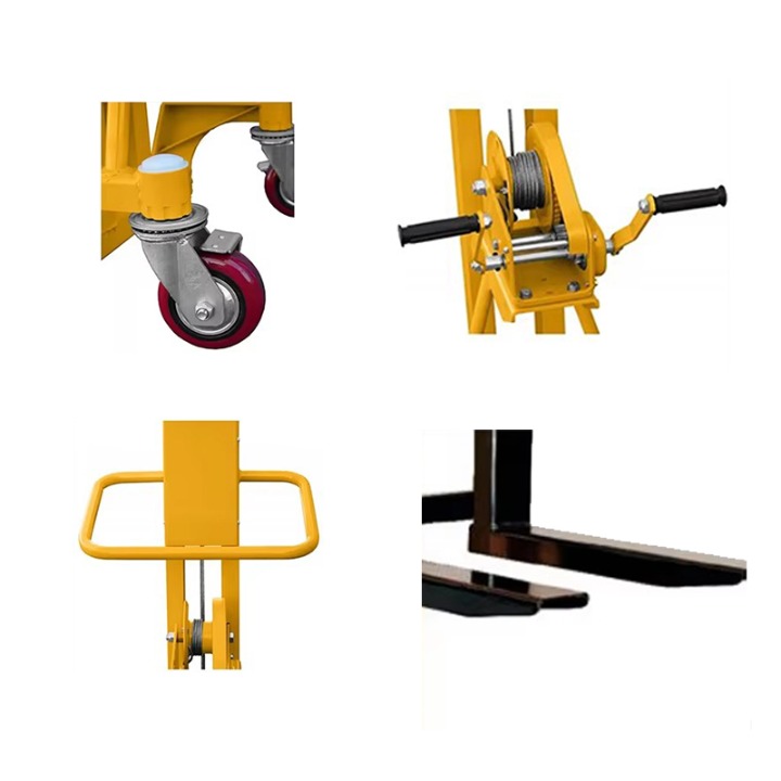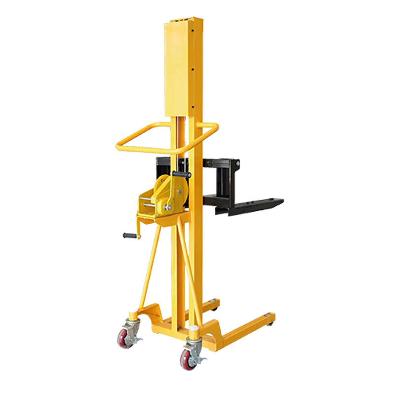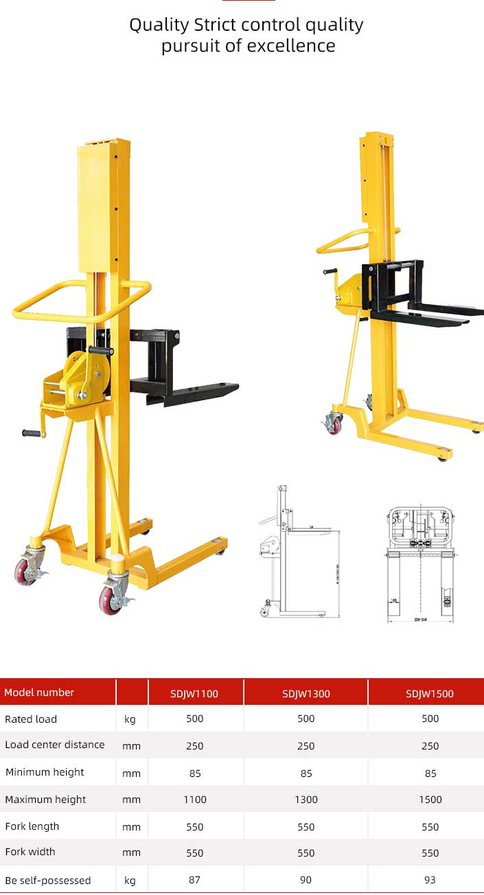 500 kg käest kaubaaluse stakcer Käsiseadet pöörates juhib operaator sisemise mehaanilise struktuuri lasti kahvli tõstmiseks või alandamiseks, saavutades seeläbi virnastaja virnastamise.